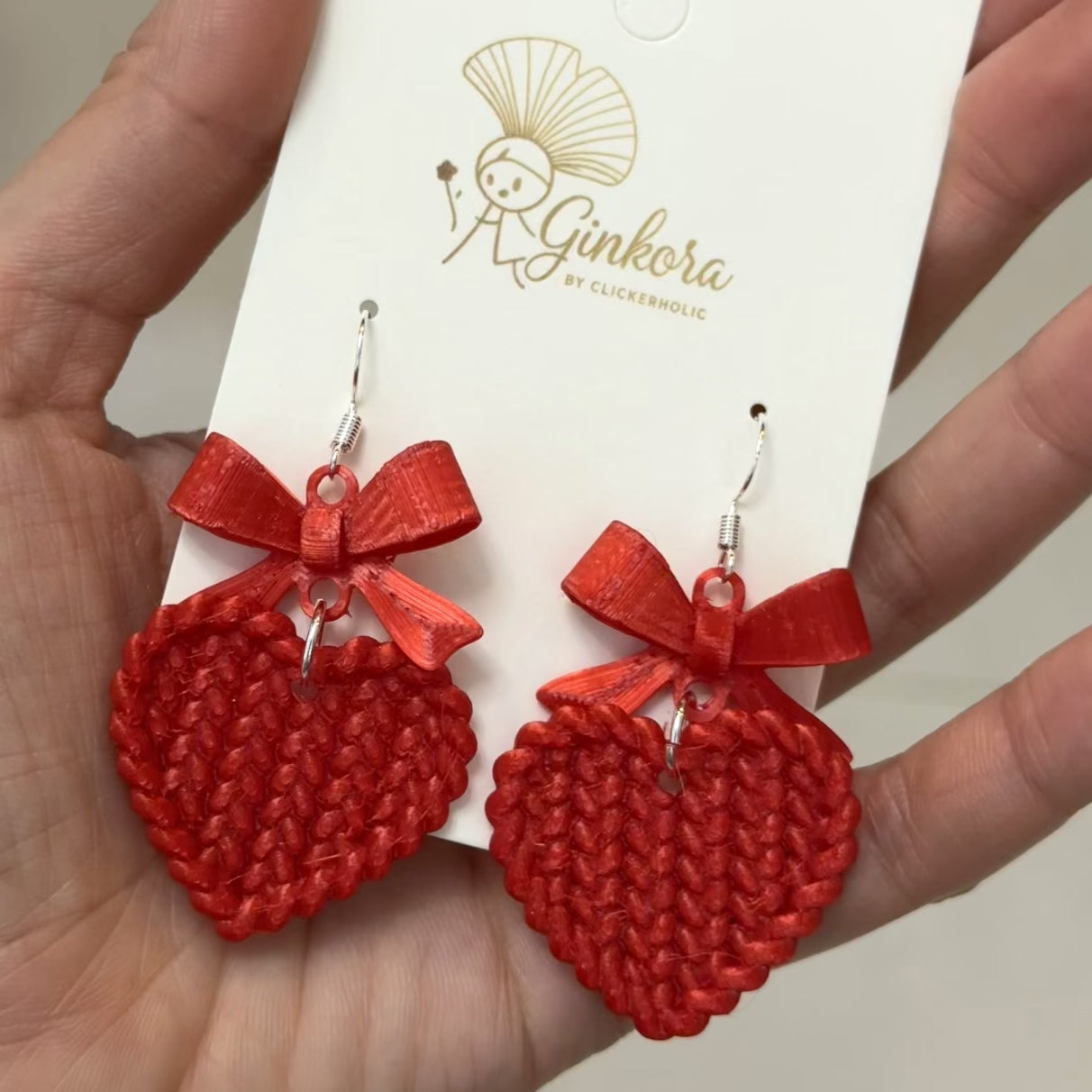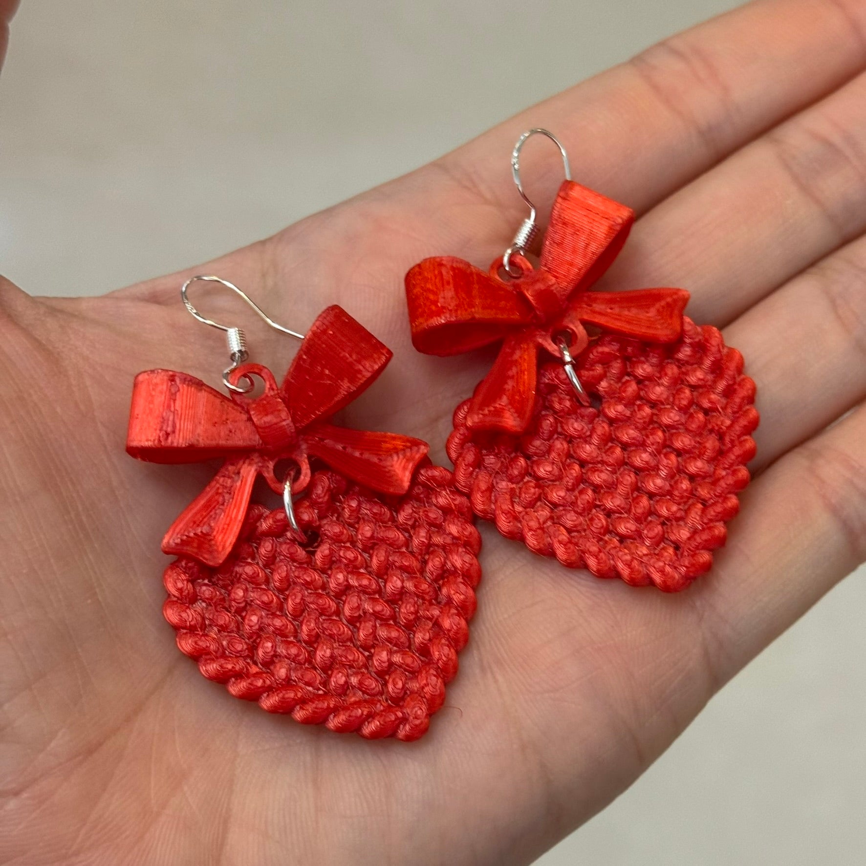 Sweet, bold, and full of love—these handcrafted earrings feature textured woven hearts topped with dainty red bows.